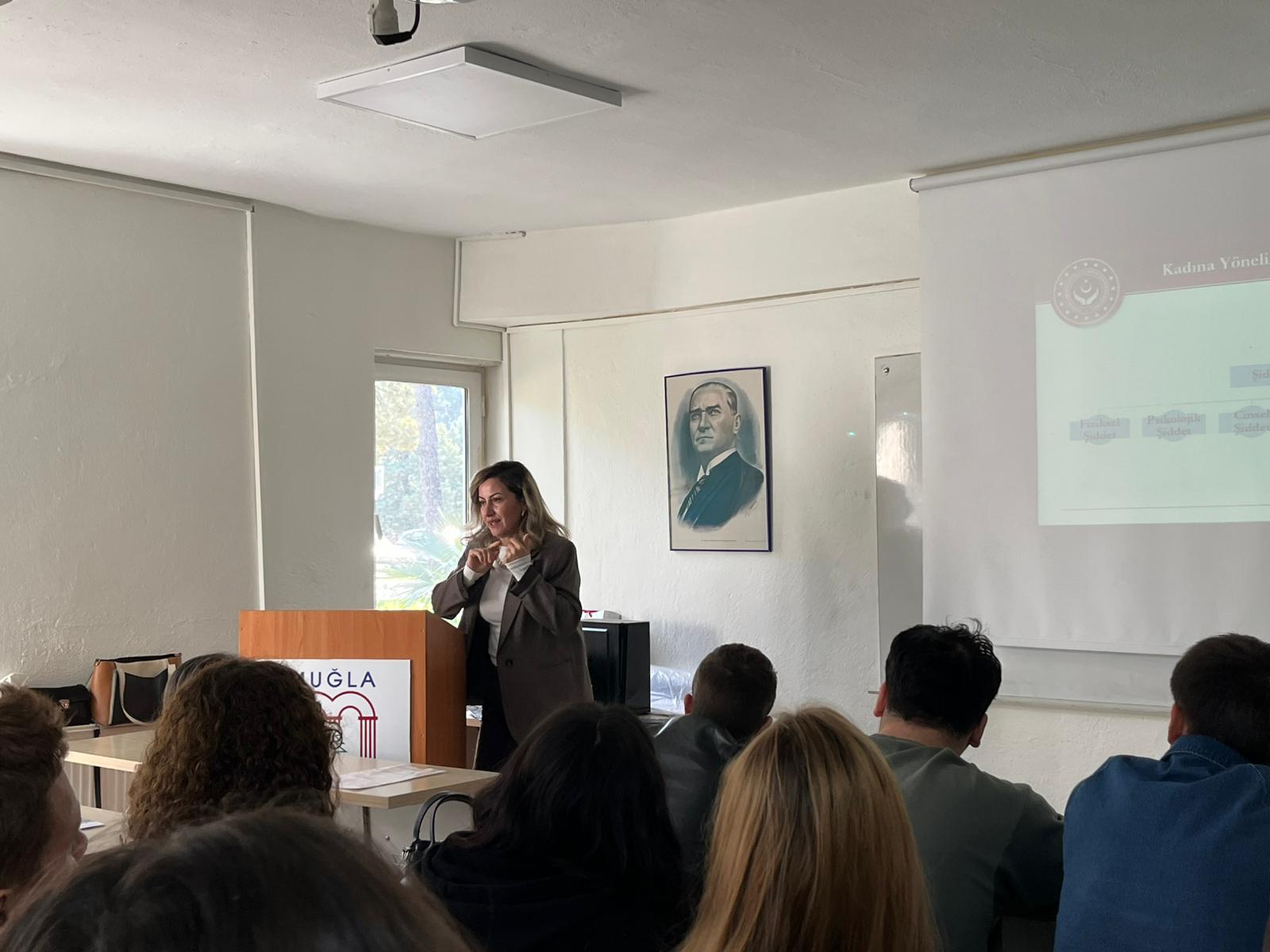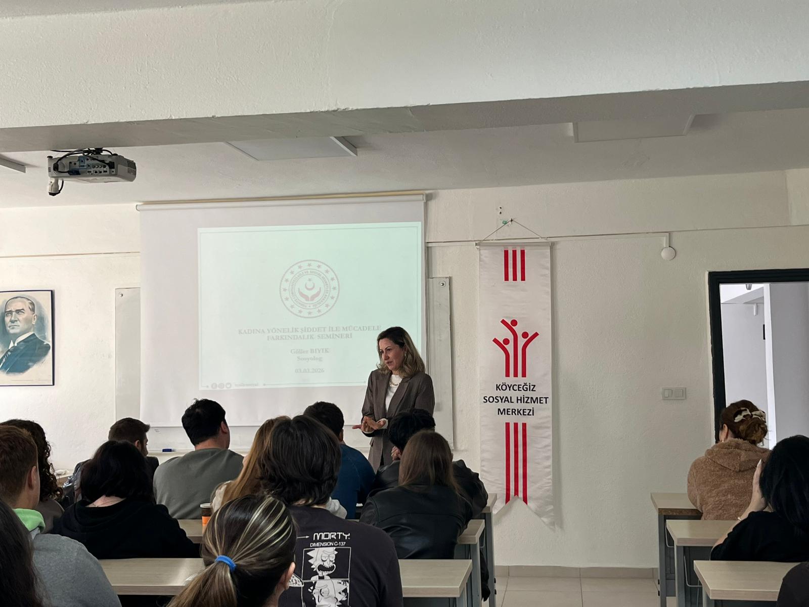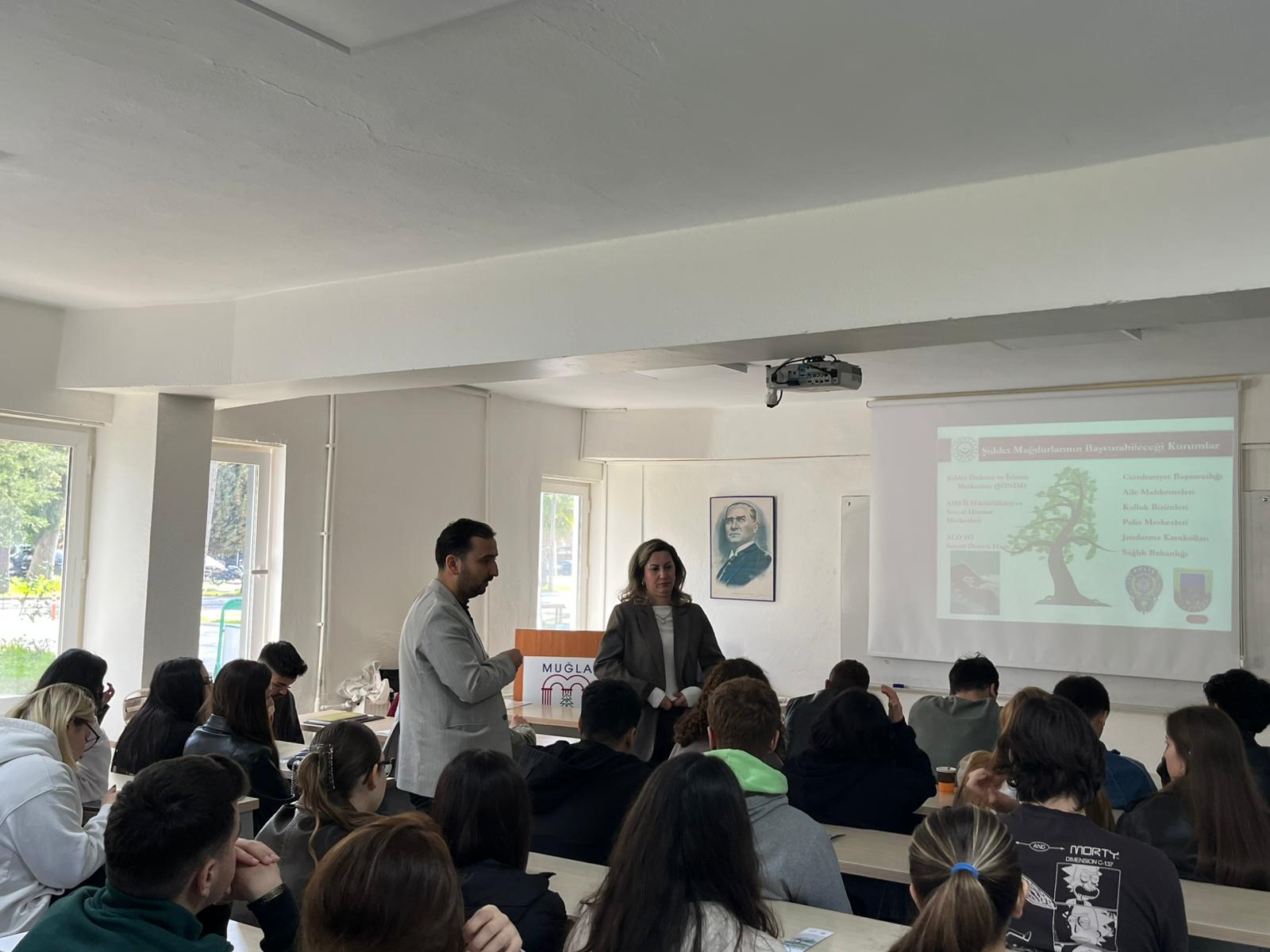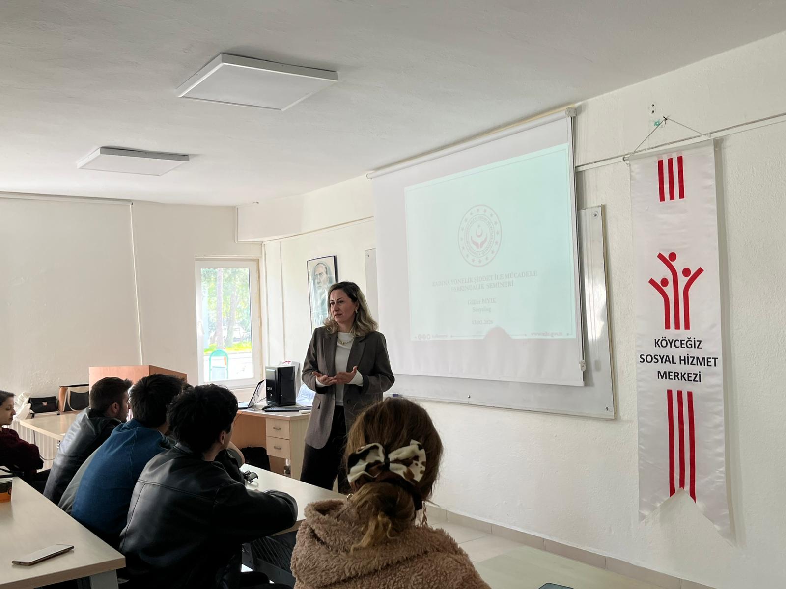 A conference titled "Awareness in the Fight Against Domestic and Gender-Based Violence" was held at Dalaman Vocational School. The event, which took place on March 3, 2026, at 11:00 a.m., featured speakers Emel Ayşe Üvez Çoban, Ramazan Dovan, and Güler Bıyık from the Köyceğiz Social Services Center Directorate. The conference addressed the social impacts of domestic and gender-based violence, protection mechanisms, and efforts to raise awareness. The program, which also included a Q&A session with participants, concluded with great interest from the students.