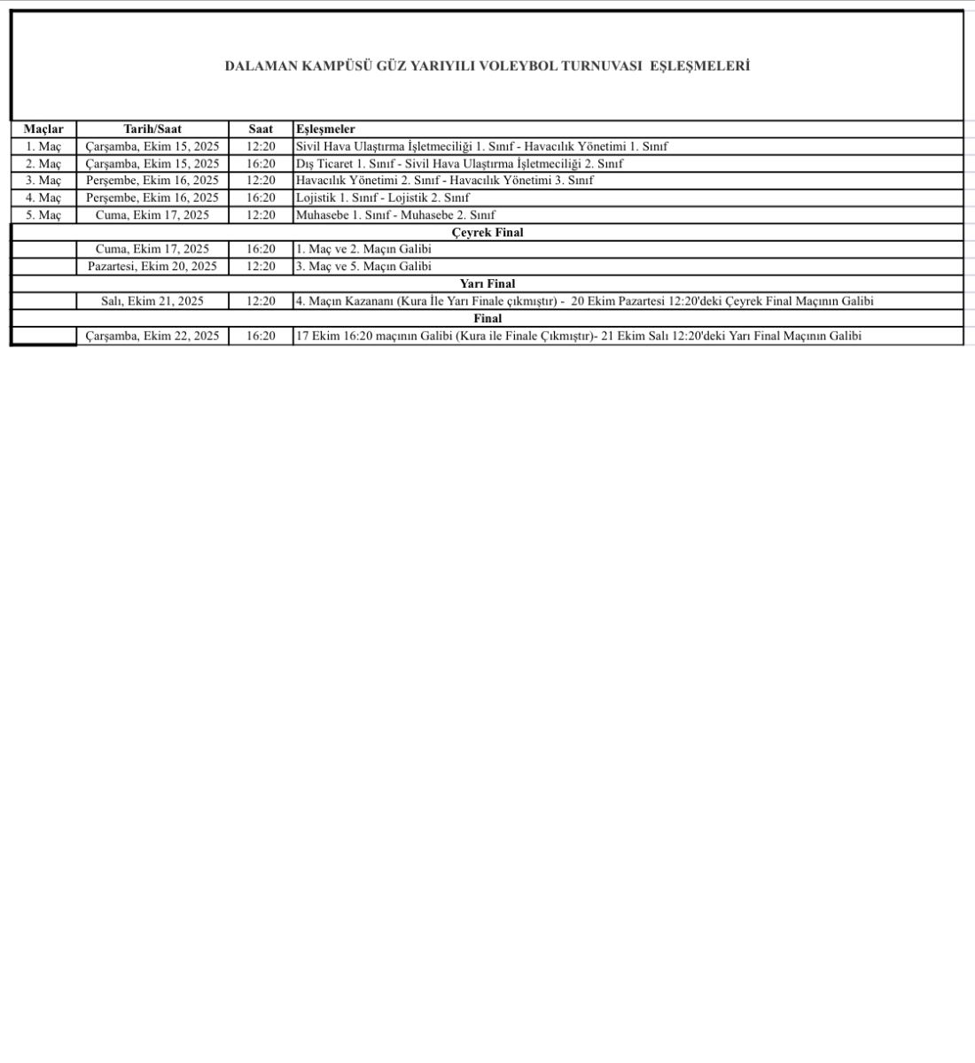 DALAMAN KAMPÜSÜ GÜZ YARIYILI VOLEYBOL TURNUVASI EŞLEŞMELERİ Son Güncelleme : 14.10.2025 14:22 Okunma Sayısı : 10
